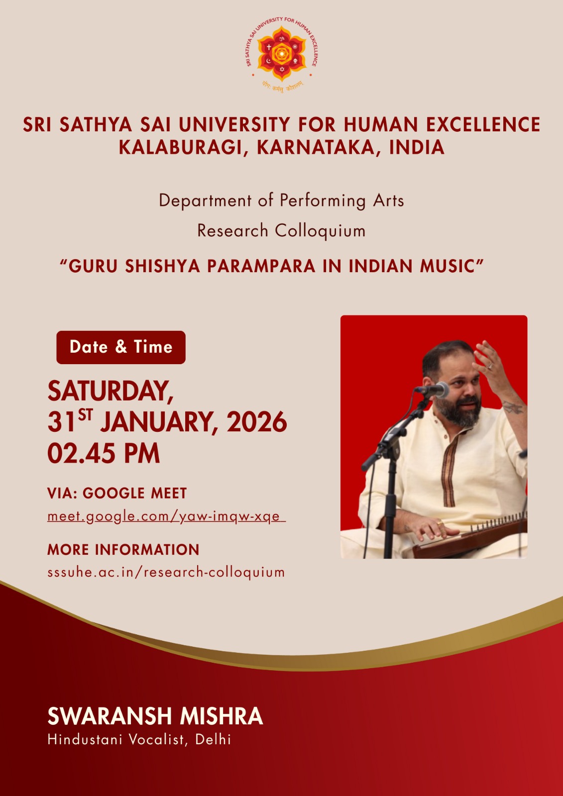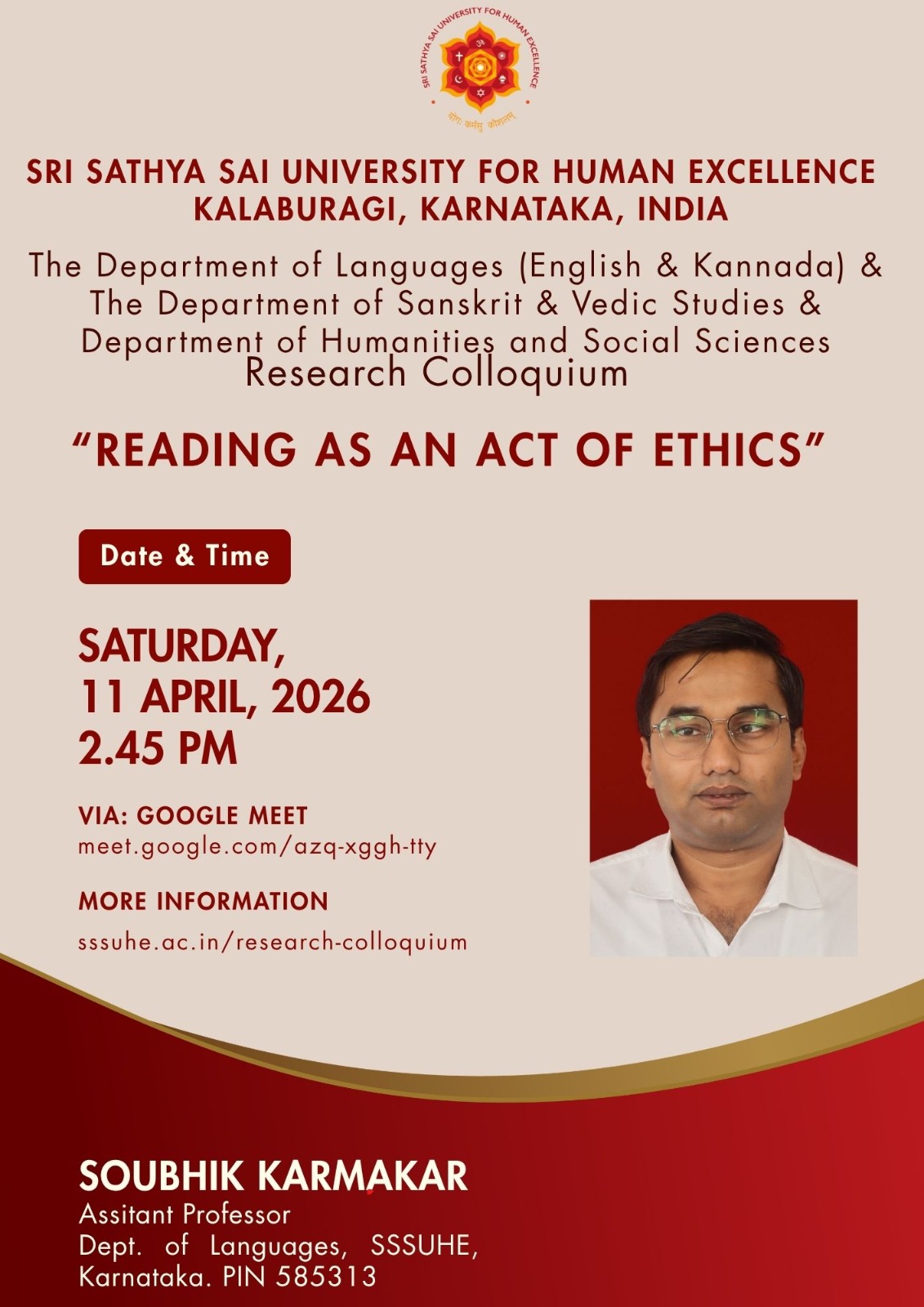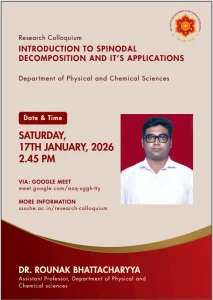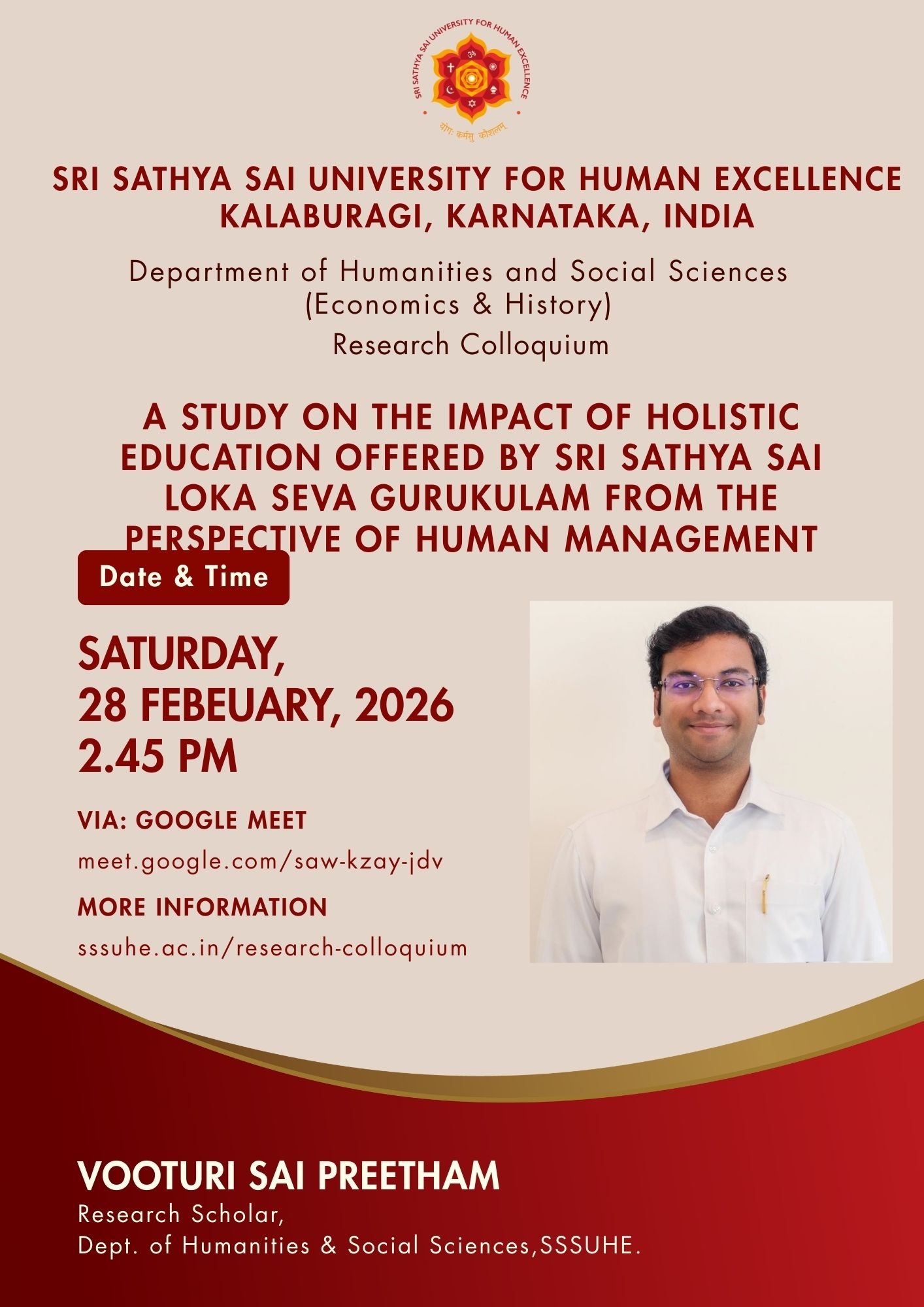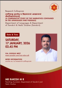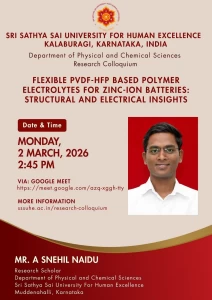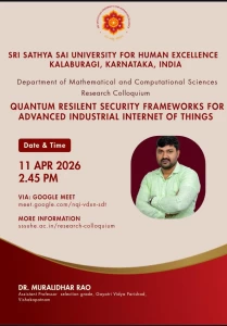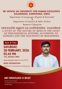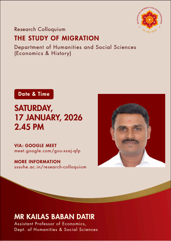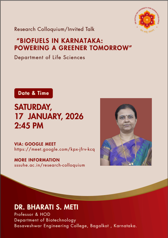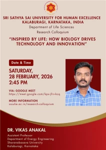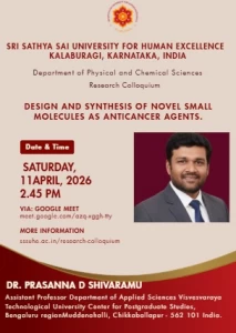 The Sri Sathya Sai University for Human Excellence aims to foster rich research culture by providing a platform for sharing ideas, methodologies, and findings among faculty and students, through organizing weekly research colloquium sessions, at the University, scheduled every Saturday from 2:45 PM to 4:00 PM. By encouraging interdisciplinary collaboration, innovative thinking and research collaborations can be stimulated. These sessions will feature guest speakers, research presentations, and open discussions, creating an environment for intellectual exchange. Regular engagement and participation these events show an increase in the research productivity and overall scholarly output.
