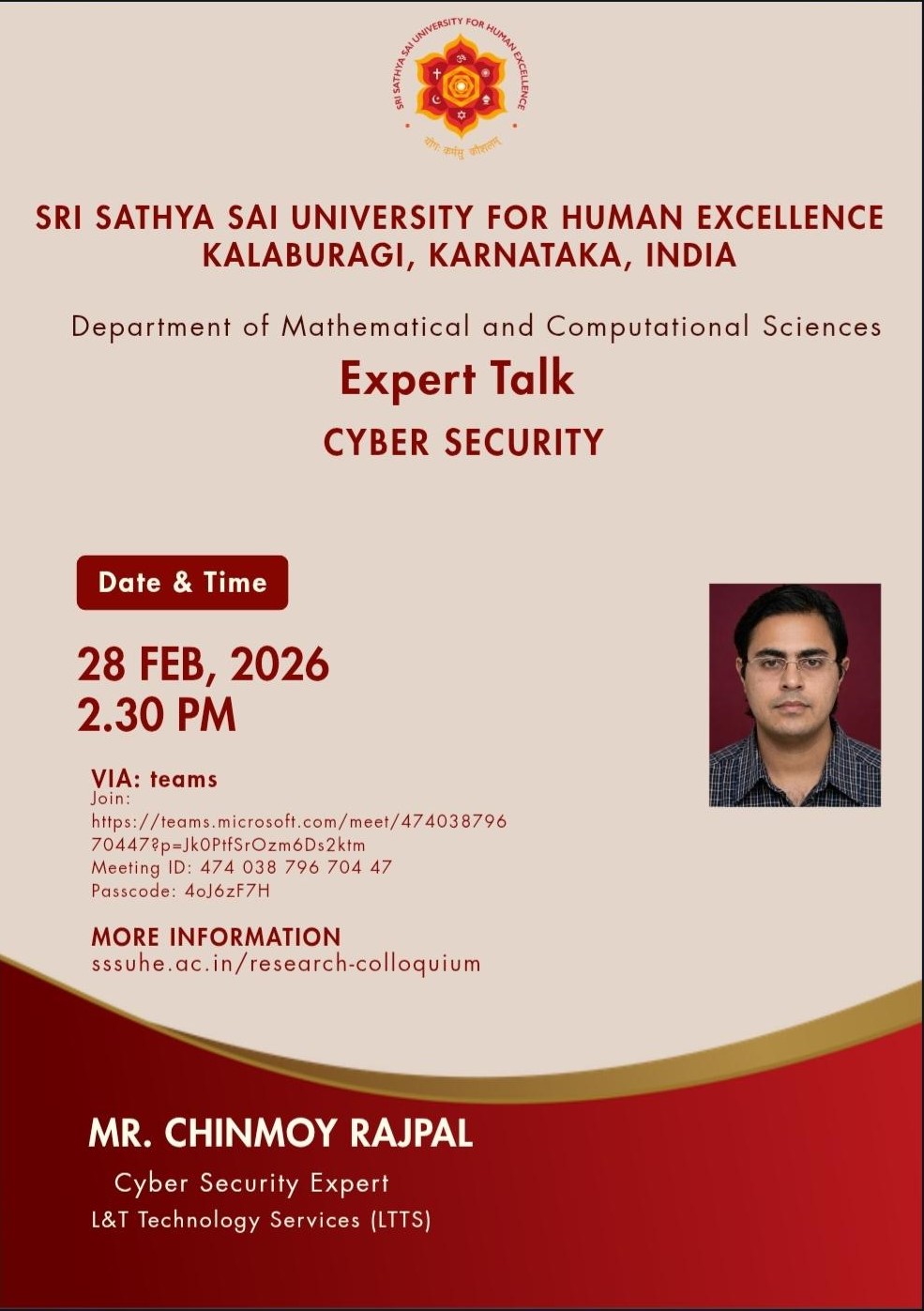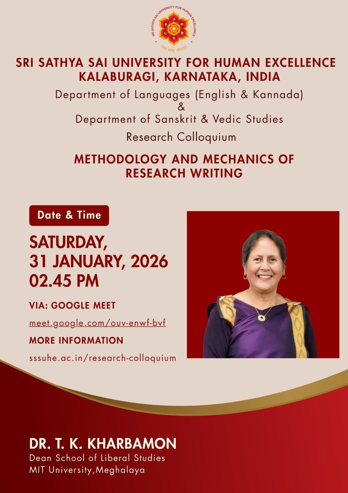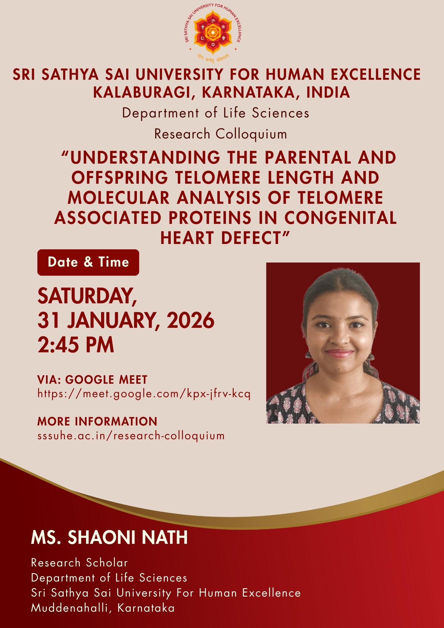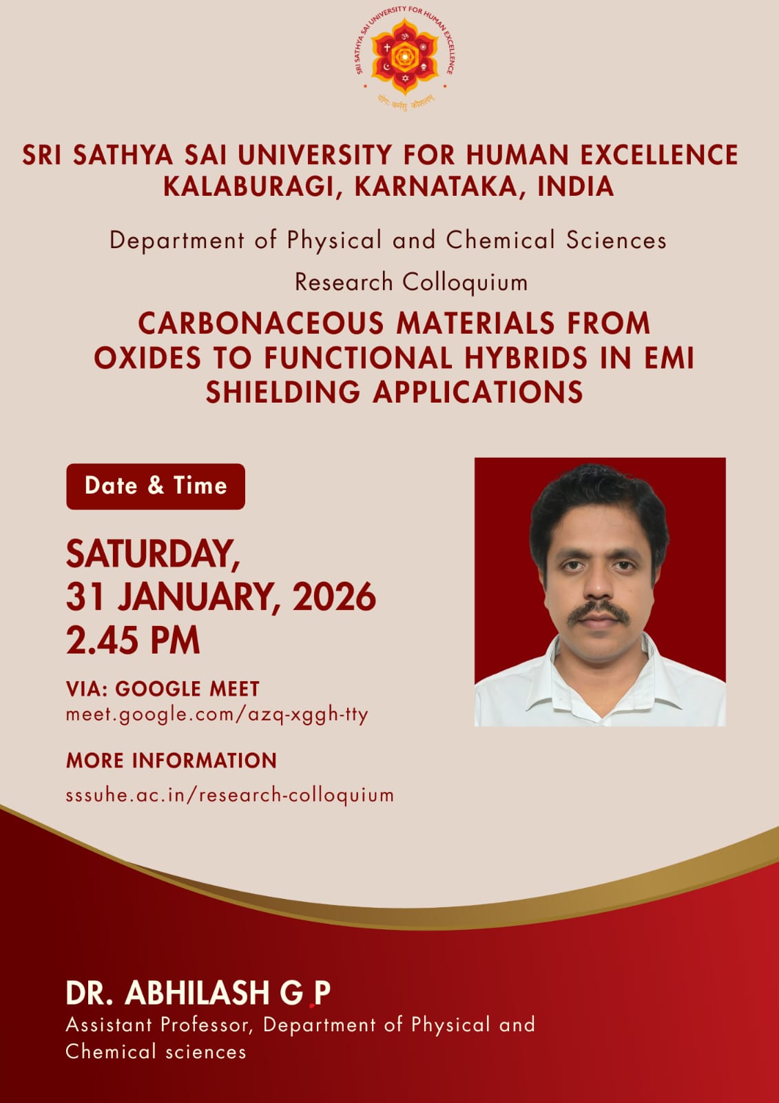 The Sri Sathya Sai University for Human Excellence aims to foster rich research culture by providing a platform for sharing ideas, methodologies, and findings among faculty and students, through organizing weekly research colloquium sessions, at the University, scheduled every Saturday from 2:45 PM to 4:00 PM. By encouraging interdisciplinary collaboration, innovative thinking and research collaborations can be stimulated. These sessions will feature guest speakers, research presentations, and open discussions, creating an environment for intellectual exchange. Regular engagement and participation these events show an increase in the research productivity and overall scholarly output.