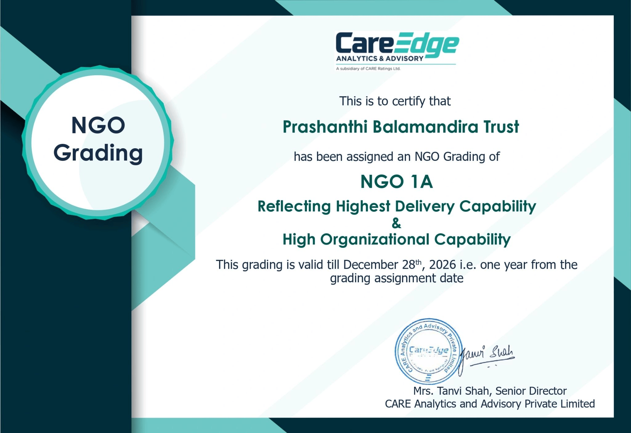We are thrilled to announce that Prashanthi Balamandira Trust (PBMT)—the sponsoring trust of our University—has been assigned the prestigious 𝗡𝗚𝗢 𝟭𝗔 𝗴𝗿𝗮𝗱𝗶𝗻𝗴 by CARE Analytics and Advisory Private Limited