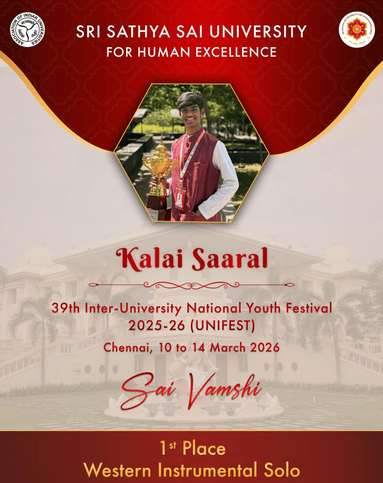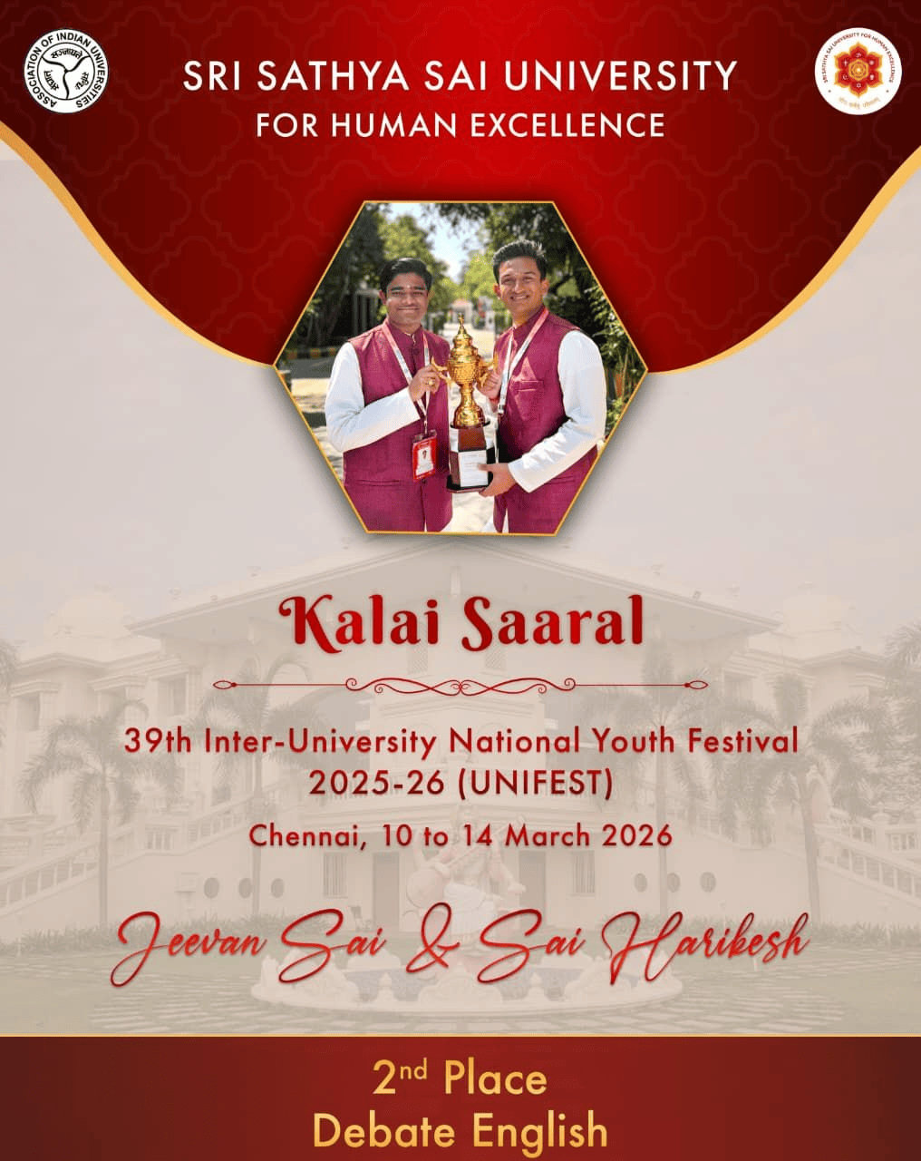 We are delighted to share a remarkable achievement by the students of Sri Sathya Sai University for Human Excellence (SSSUHE). After delivering an exceptional performance at the State and Zonal levels, our students have now excelled on the National stage—bringing immense pride and honor to the University.