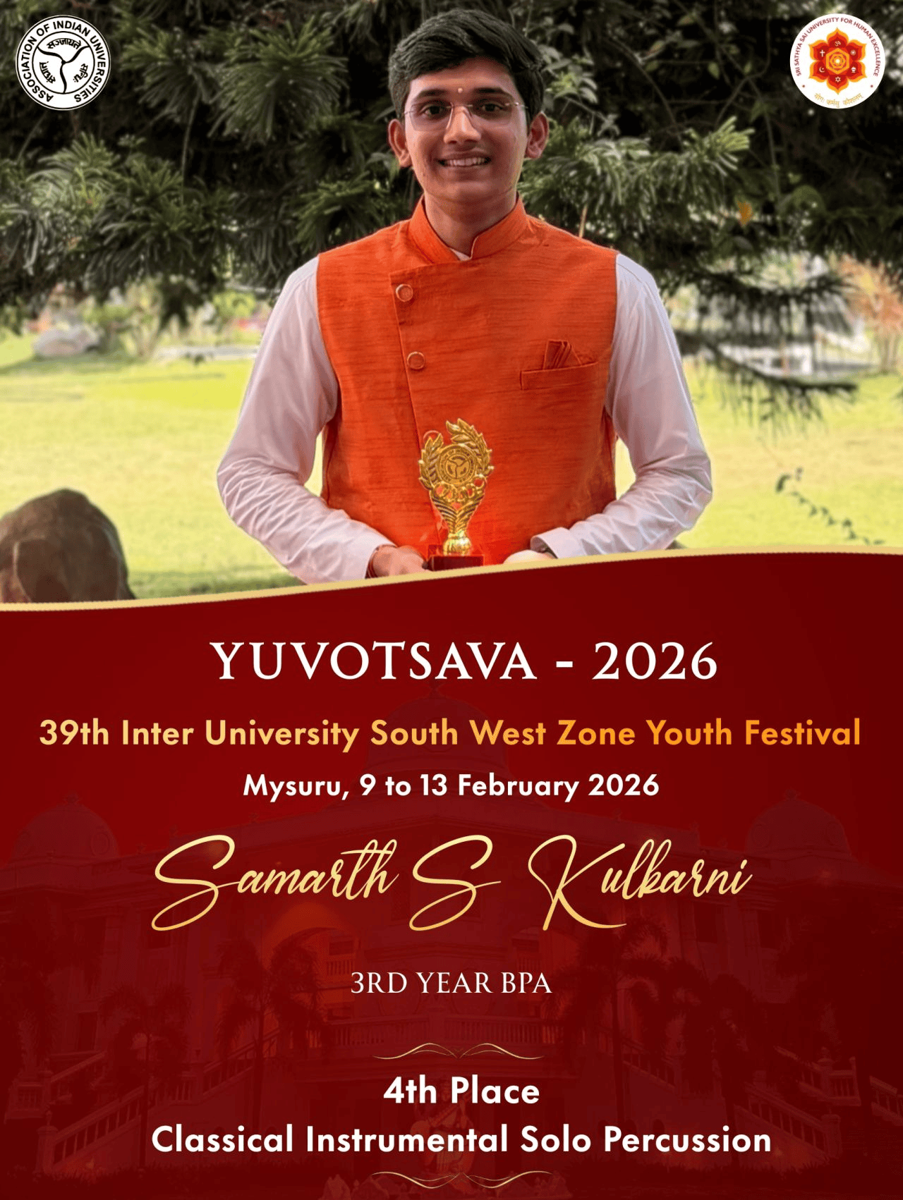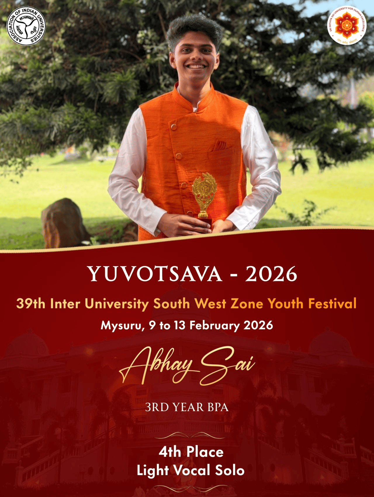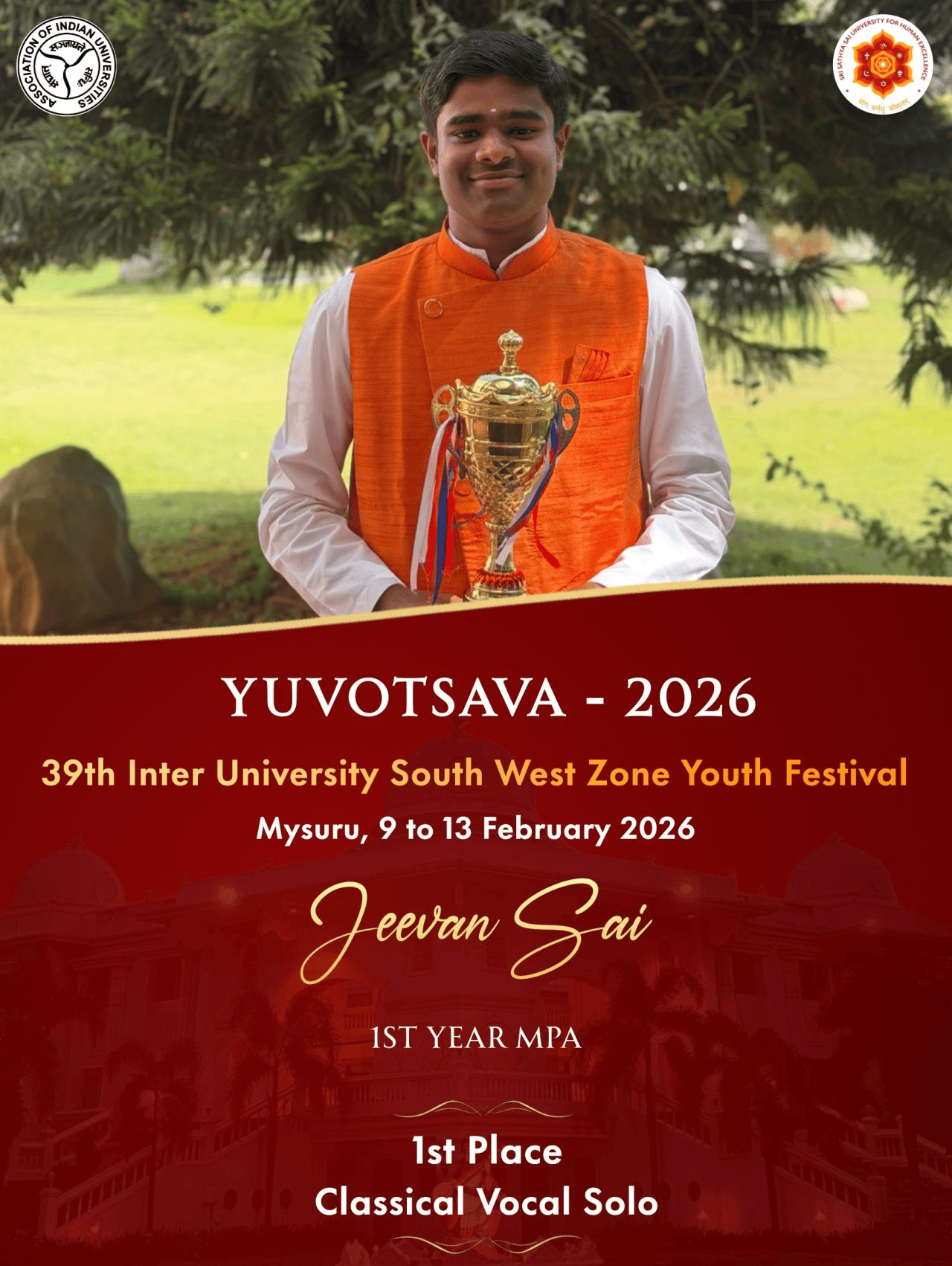The 39th AIU South-West Zone Inter‑University Youth Festival, YUVOTSAVA 2026, was held from February 9–13, 2026, hosted by JSS Academy of Higher Education & Research (JSS AHER), Mysuru, in collaboration with the Association of Indian Universities (AIU). The prestigious five‑day festival brought together 1,600 participants from 34 universities, celebrating excellence in music, dance, theatre, fine arts, and literature, with each event featuring competitors from 25 universities across the South-West Zone.